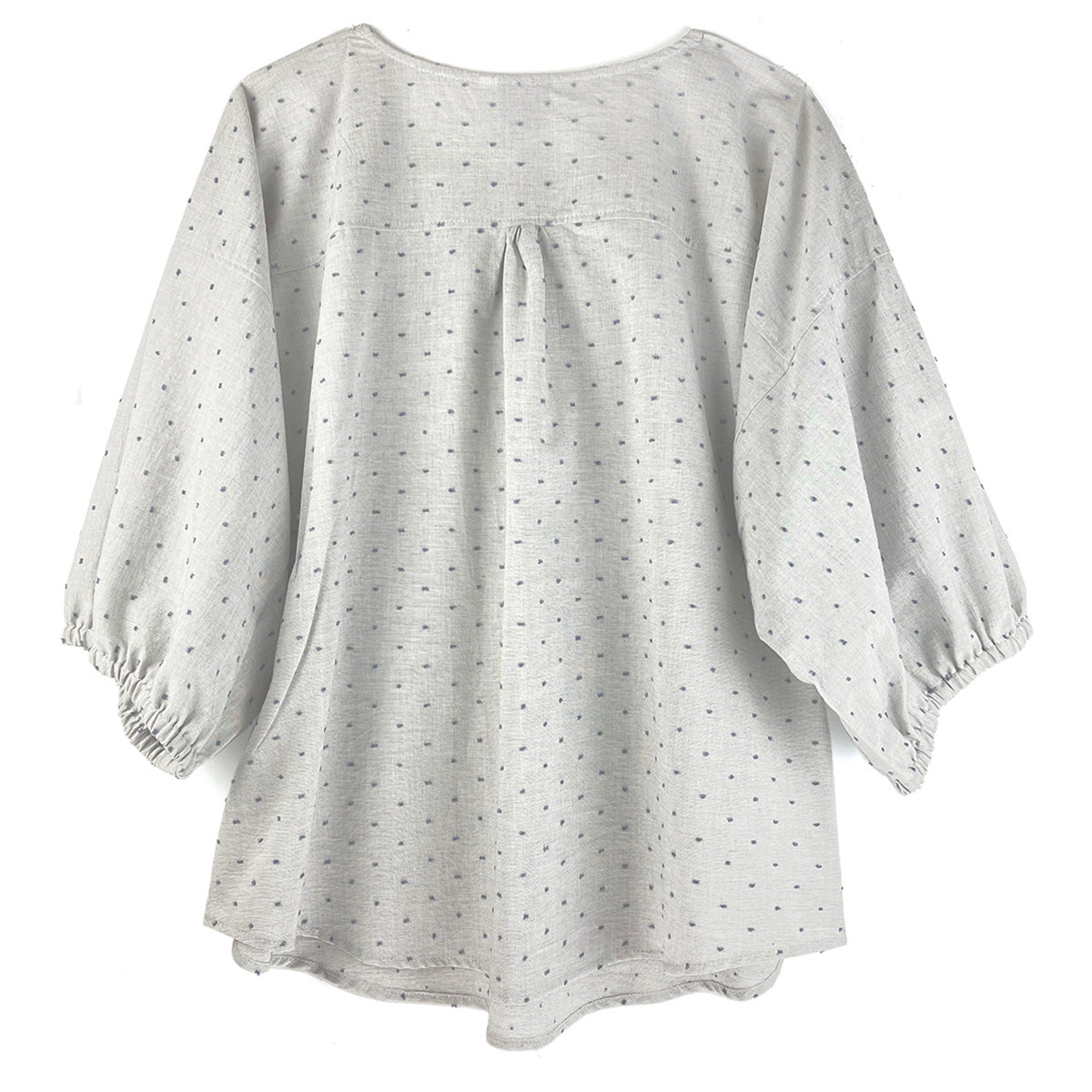 Puffy sleeve style blouse with voluminous sleeves, in airy, lightweight cotton. A neutral, pale gray shade with a textured swiss dot.