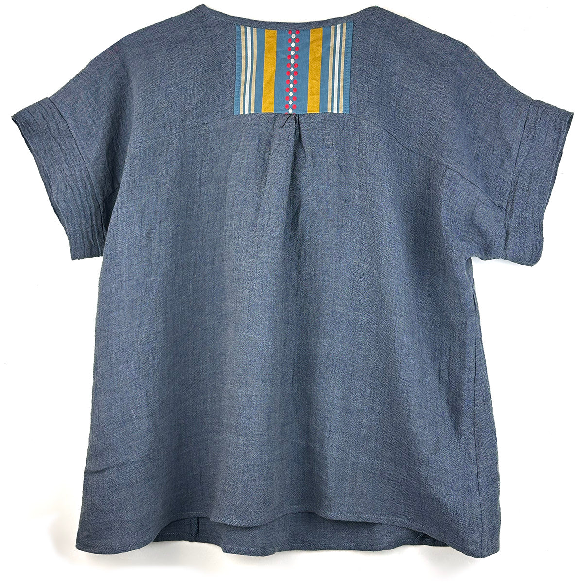Perma-crinkle mid-weight linen blouse with cotton bib detail. Yarn dyed dot and stripe pattern. Loose fitting, popover style with a tie neck. Matching cotton from the front is pieced into the back yoke.