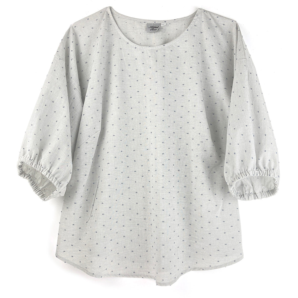 Puffy sleeve style blouse with voluminous sleeves, in airy, lightweight cotton. A neutral, pale gray shade with a textured swiss dot.